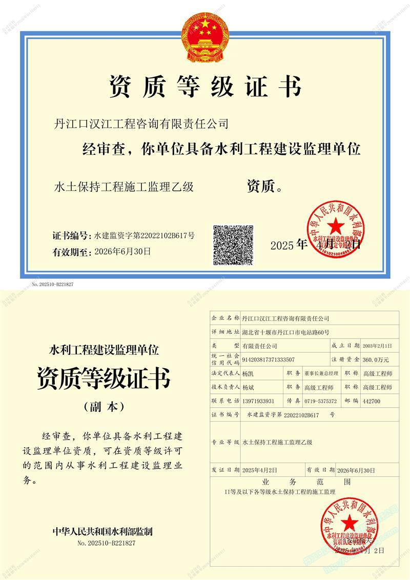 (原漢江綜合開發(fā)公司水利水電監(jiān)理中心)成立于 1989年3月,1993年6月經(jīng)水利部審批成為首批注冊監(jiān)理單位 (隸屬于長江水利委員會), 注冊資本 360萬元 。公司位于湖北省十堰市丹江口市電站路。公司目前擁有水利部頒發(fā)的 水利工程施工監(jiān)理甲級 、 水土保持工程施工監(jiān)理 乙 級 資質(zhì) ;住建部頒發(fā)的 房屋建筑 、 市政公用工程監(jiān)理 乙 級資質(zhì) 。 可獨立承擔 各類水利水電工程 、 一般工業(yè)與民用建筑工程監(jiān)理 , 土地整治 , 招標代理 、 技術咨詢 等業(yè)務。公司實行董事會領導下的總經(jīng)理負責制,下設辦公室、經(jīng)營部、財務部、工程技術部等職能部門。……